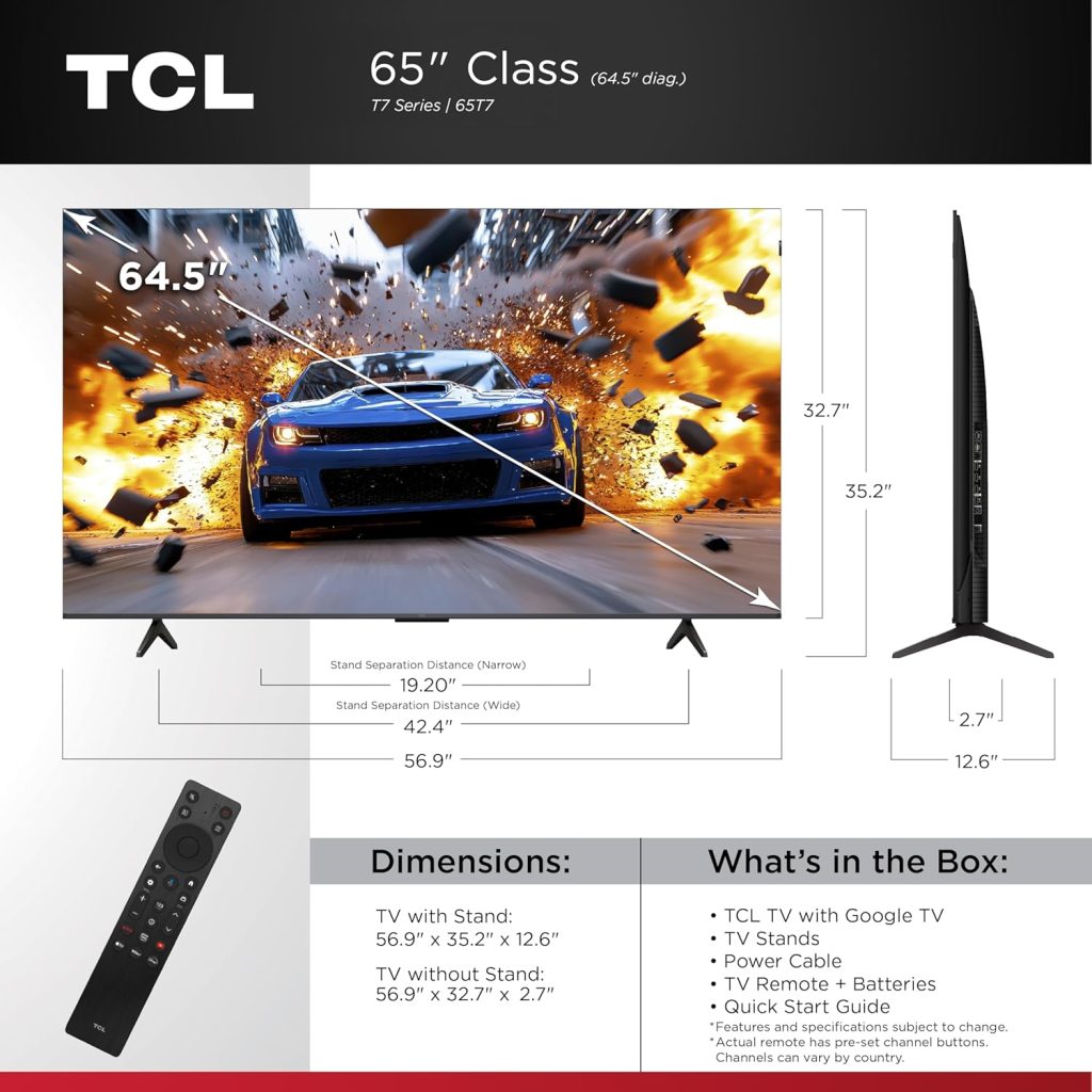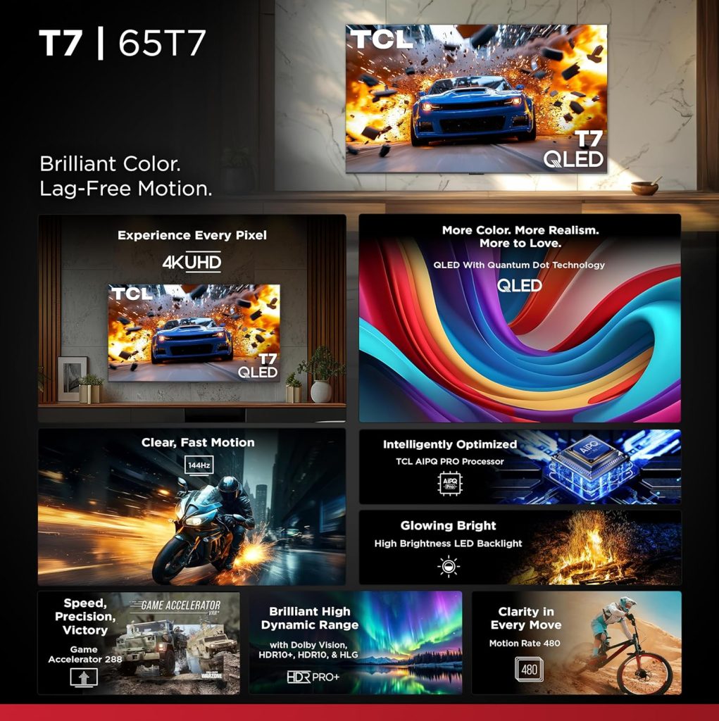 TCL 65 Inch Class T7 Series, 4K QLED HDR, 120HZ-144HZ High Brightness Smart Google TV Dolby Atmos Audio, Voice Remote Alexa Gaming Streaming Television, 65T7
