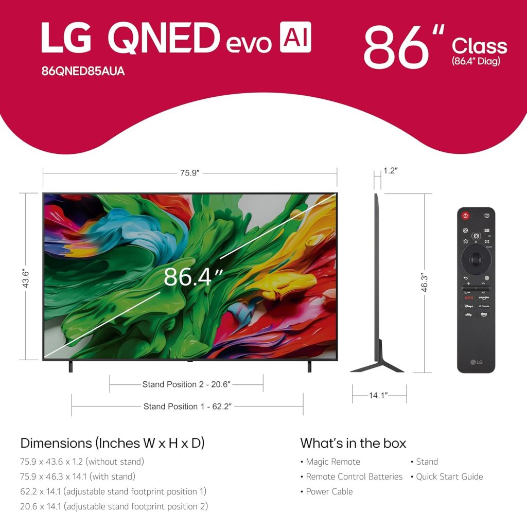 LG 86-Inch Class QNED evo AI QNED85A Series Mini LED 4K Smart TV wAI Picture, Sound, Super Upscaling 4K, HDR10, Filmmaker Mode, Wow Orchestra, Alexa Built-in, 86QNED85AUA