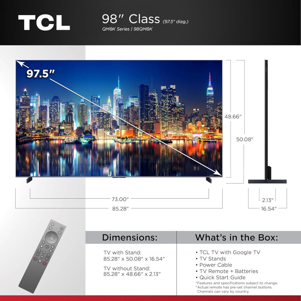 TCL 98 Inch Class QM8K Series, Mini LED QLED 4K HDR, 120HZ-144HZ Anti Reflective Wide Angle Screen Smart Google TV Dolby Atmos, Voice Remote Alexa Gaming Streaming Television, 98QM8K